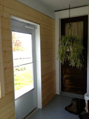 The porch is finished, finito, done! This may be the first project my dad has actually followed through with 100% since moving into the Green Acre's homestead 23 years ago. He's just a little proud... and he should be. He took my parent's falling apart front porch and converted it to a now insulated, somewhat warm despite the onset of cold weather, country-chic room.